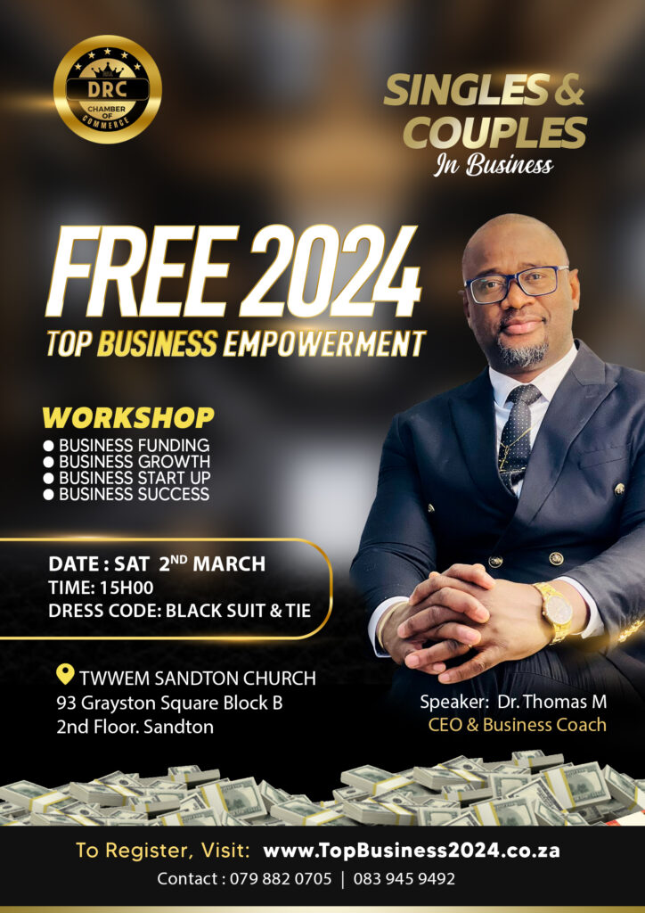 Join us for this Singles and Couples in Business “2024 Free Top Business Empowerment Seminar workshop”! Seize the chance to embark and be empowered on your entrepreneurial journey! Whether you’re a seasoned entrepreneur or an aspiring business owner, this workshop is designed just for you. Reserve your free spot today!